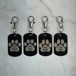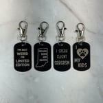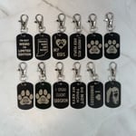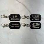 These engraved metal dog tag style keychains are a fun way to express yourself, and would make a great gift.